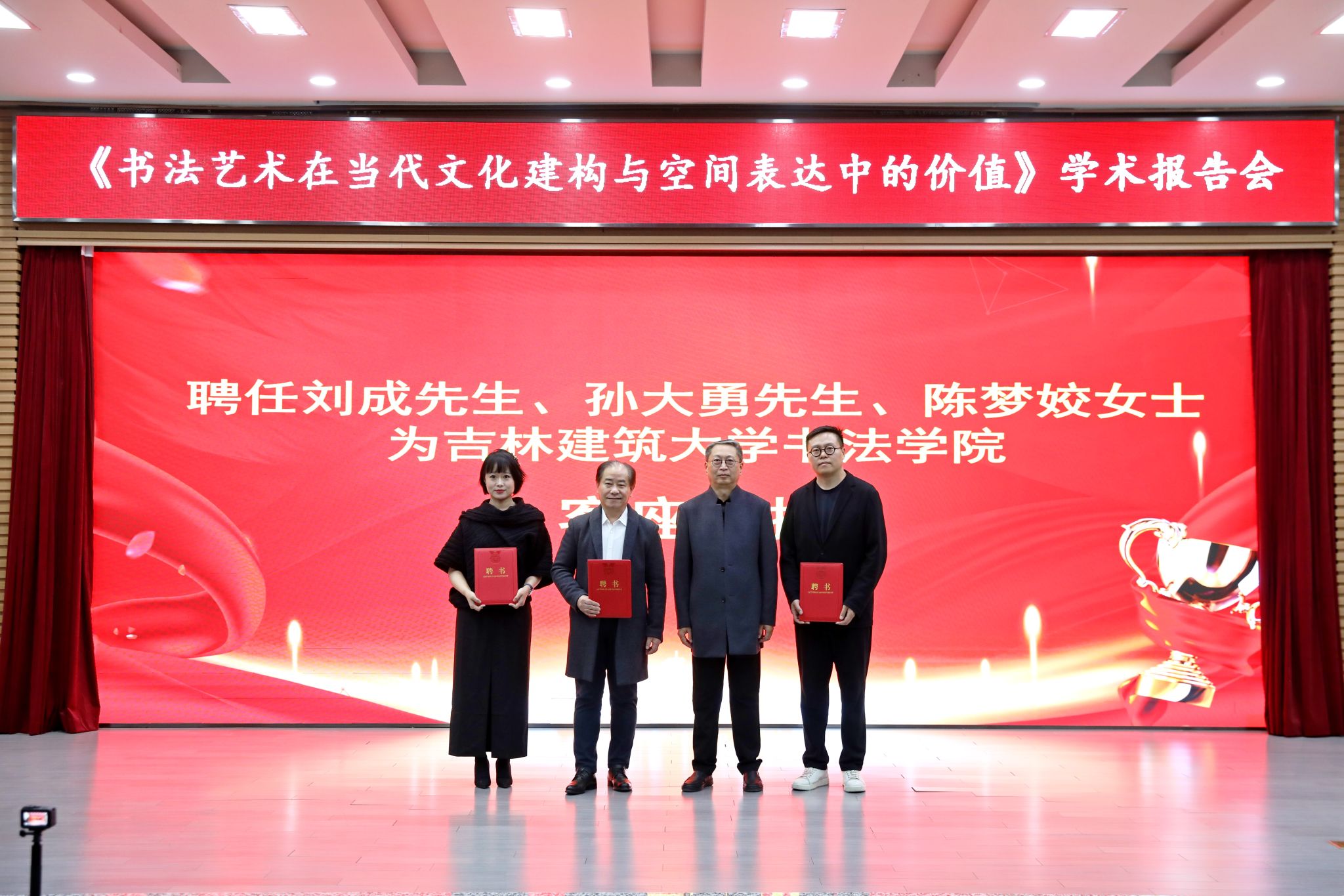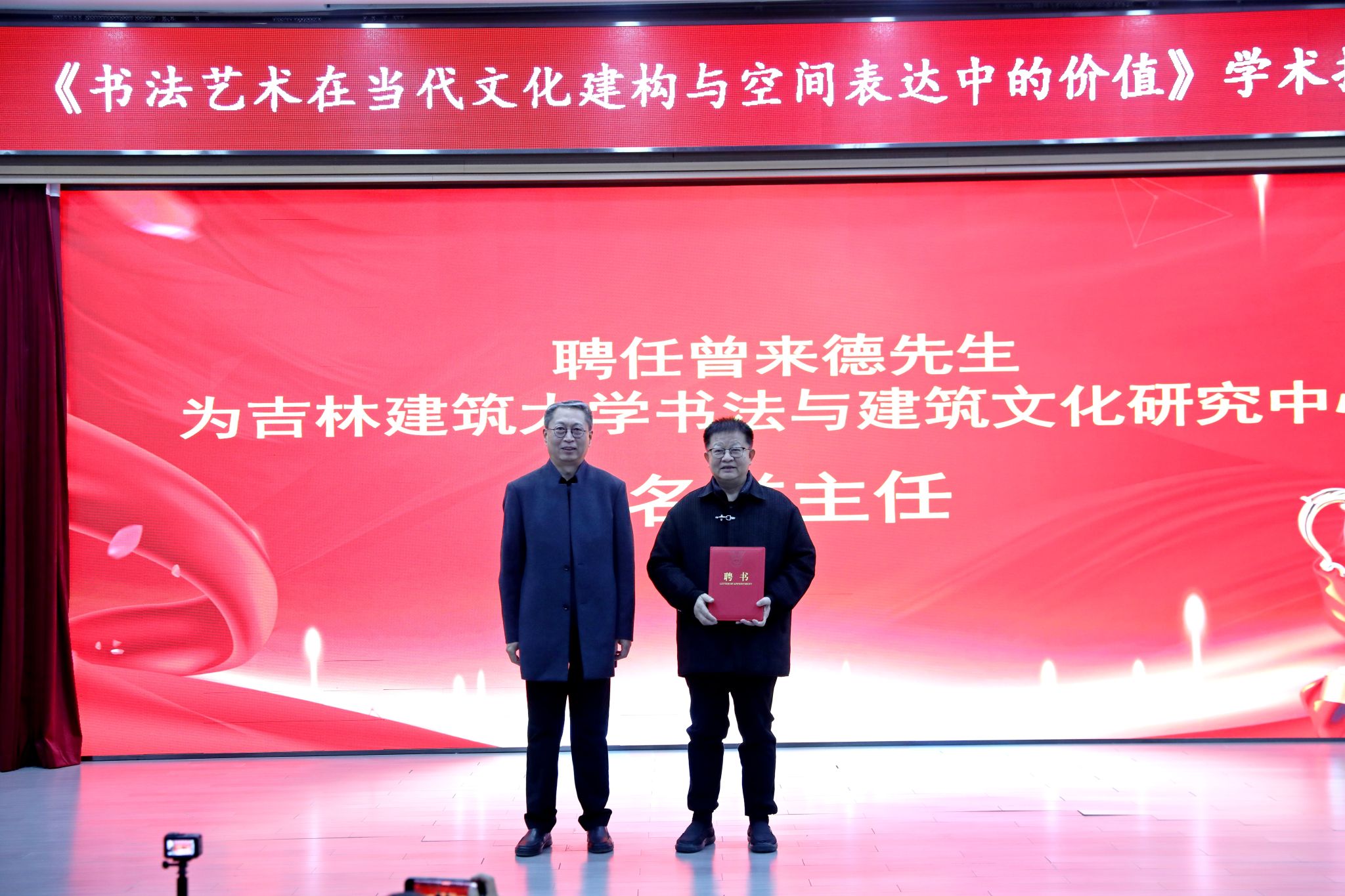 活动现场,首先举行了聘任仪式。在全校各学院师生代表的共同见证下,齐伟民副校长为曾来德先生颁发“吉林建筑大学书法与建筑文化研究中心名誉主任”聘书。为刘成先生、孙大勇先生、陈梦姣女士三位艺术家颁发“吉林建筑大学书法学院客座教授”聘书。此次聘任是学校推进书法与建筑学科交叉融合的重要举措,为相关领域的人才培养与艺术创新注入新的力量。